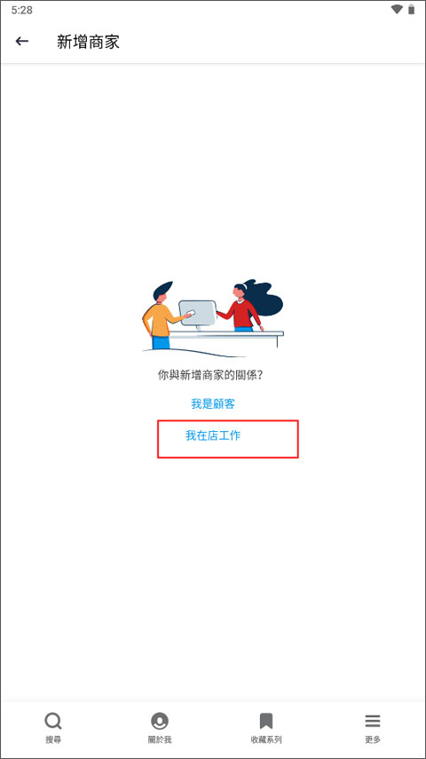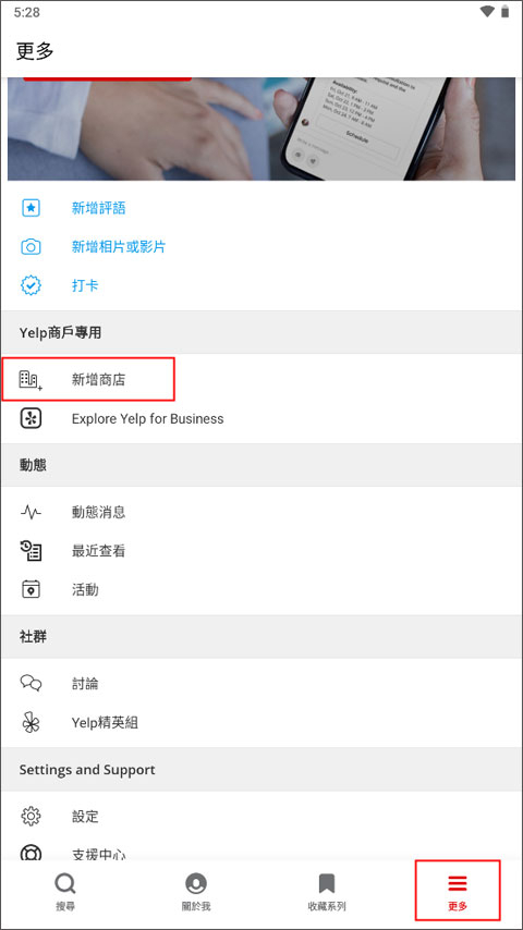 1、打开默认进入到“搜寻”板块,点击切换到【更多】页面,找到Yelp商户专用中的“新增商店”。