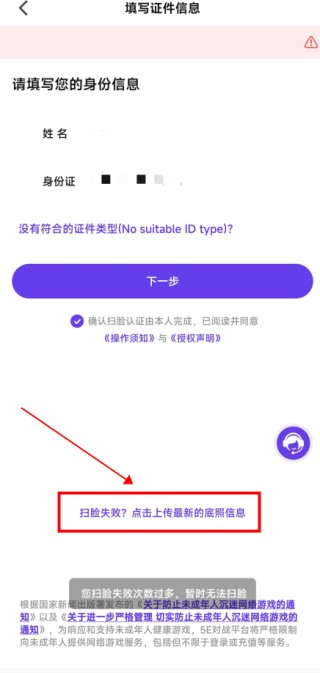 在认证失败页面的下方,您会看到底照上传的入口。请在此处上传您的底照图片。一旦上传成功,我们将进入审核流程,通常情况下,审核将在1到3个工作日内完成。审核通过后,您可以继续进行扫脸认证。
