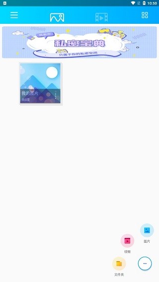 完成上述设置后即可正式使用,如图所示,这里分别设有图片和视频的私密添加选项。点击下方的“+”号,就能选择要添加的照片或视频;而文件夹功能则支持自定义图片分类的名称。