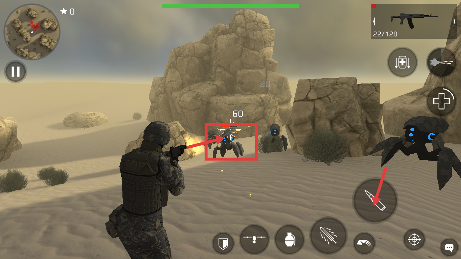 进入沙漠战斗场景后,对准机械敌人,使用步枪等武器发起攻击,注意弹药剩余量(例如22/120),确保精准命中敌人。