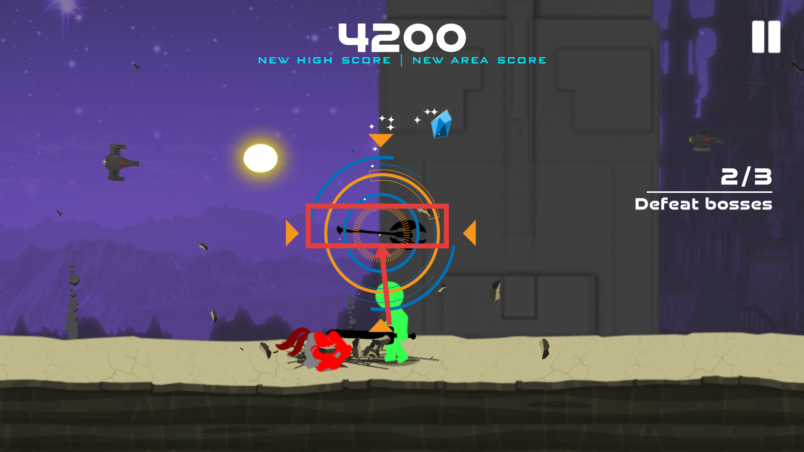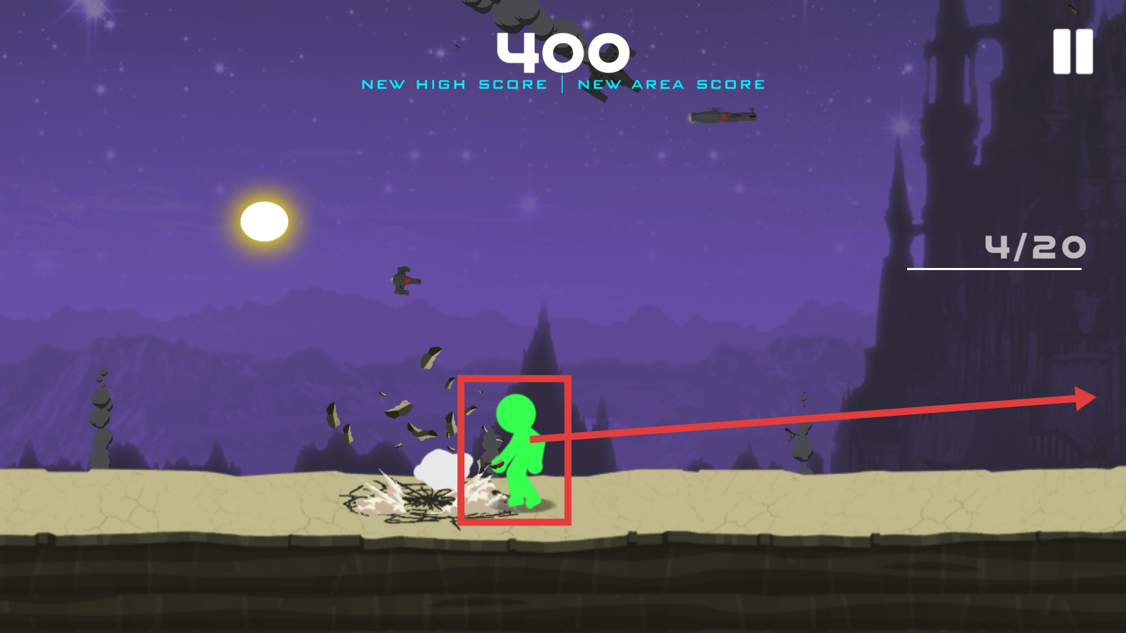控制绿色角色向右移动,战胜普通敌人,获得400分,推进区域得分进度。