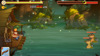2、在对局中玩家将乘坐竹筏进行闯关,这这里要时刻小心河道中冒出来的鳄鱼。