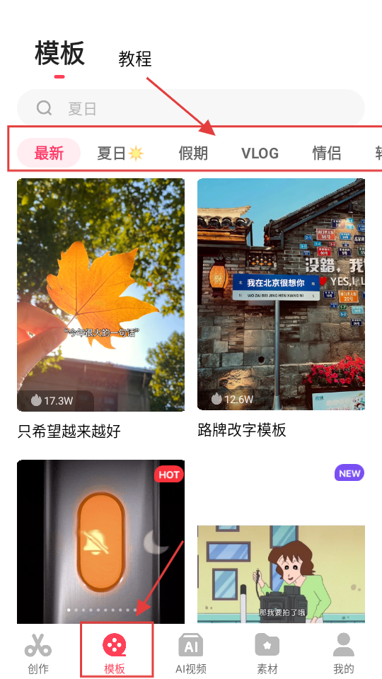 模板页面设有【最新】【夏日】等分类,还包含海量模板资源,底部的【模板】按钮十分醒目,点击该按钮即可浏览各类模板。