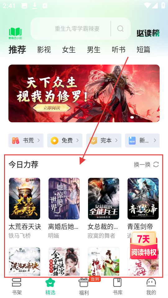 打开软件后,进入精选页面的【今日力荐】板块,这里有不少精彩的小说,赶紧挑选一本自己感兴趣的,开启你的阅读之旅吧。