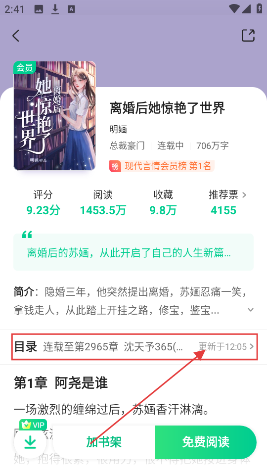 进入小说详情页面后,你可以看到评分、阅读量等相关信息。如果想要选择章节阅读,点击【目录】按钮即可。