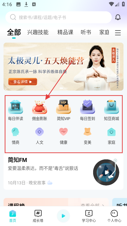 进入软件首页后,能看到不少功能入口。要是想查找情商类的内容,只需点击【情商】选项,就能浏览相关内容了。