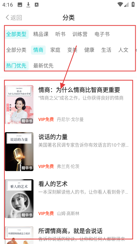 进入分类页面后,可以筛选出情商相关的内容,比如《情商:为什么情商比智商更重要》这类,要是觉得合适就点击查看。