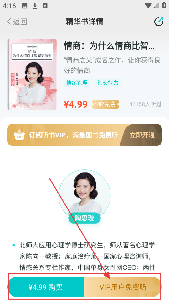 进入精华书的详情页面后,如果想要免费收听,只需点击【VIP用户免费听】按钮即可,但前提是你得是VIP用户哦。