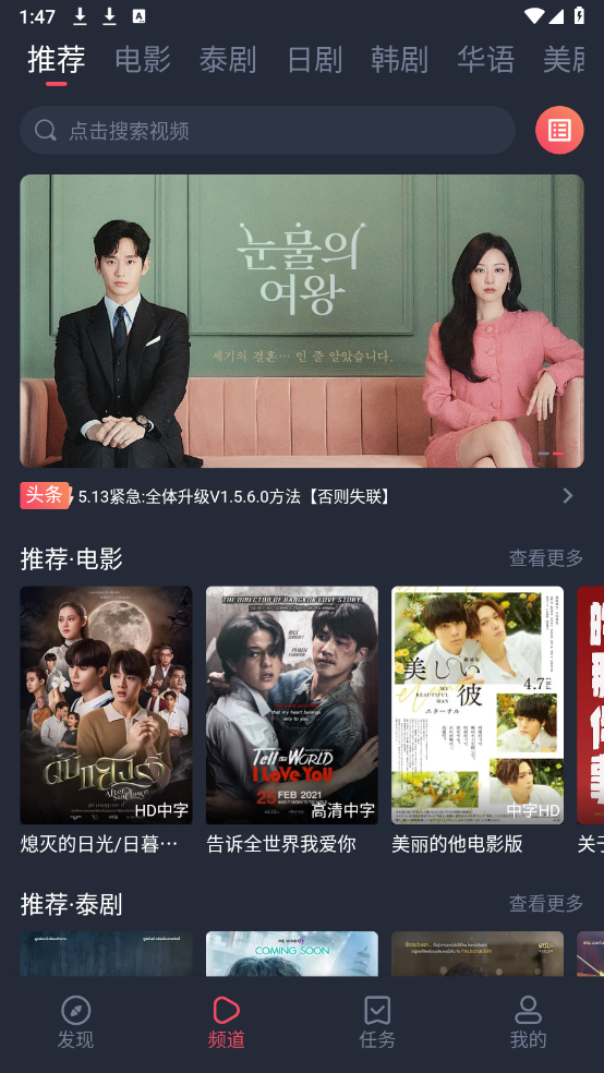 打开软件后,这里汇聚了丰富多样的影视资源,涵盖电影、泰剧、日剧和韩剧等多个类别。
