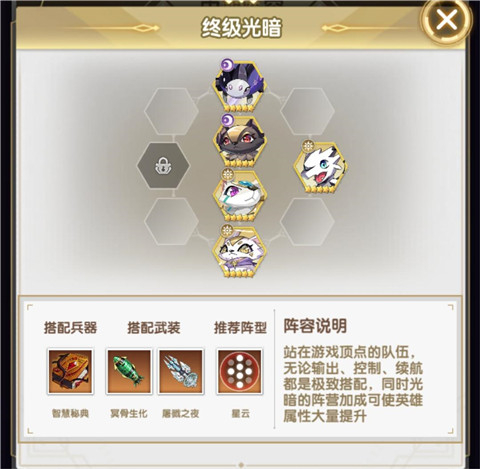 位于游戏巅峰的队伍,在输出、控制和续航方面都达到了最佳组合,同时光暗阵营的加成能够大幅度提高英雄属性。