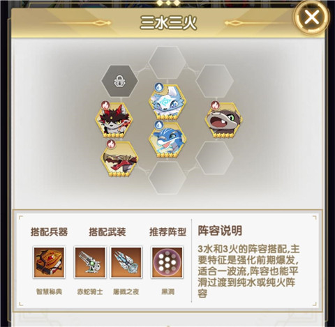 3水和3火的组合,主要特点是增强前期的爆发力,适合快速一波流打法,同时这个阵容也可以平滑过渡到全水或全火的队伍配置。