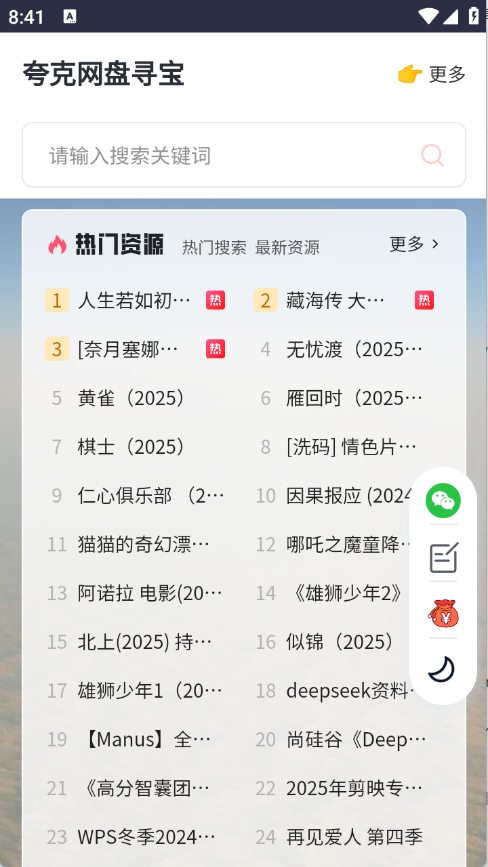 夸克网盘寻宝,这款强大的网盘搜索神器,无论是影视还是音乐都能轻松搜索,还能对搜索到的内容进行复制链接操作。所有资源全部免费,助你一键搜遍全网资源,不仅不限速,资源更新也十分迅速。