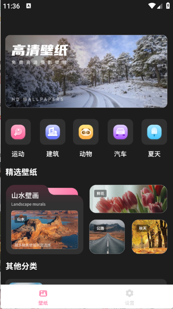 进入首页后,能看到多种壁纸类型,像运动、建筑、汽车之类的都包含在内。