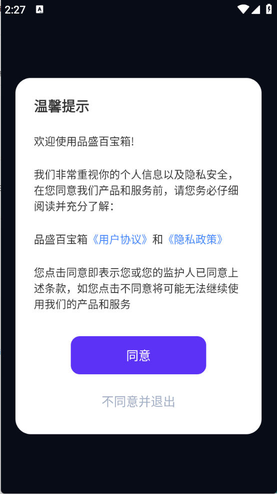 首先在3G游戏网的好品盛百宝箱里,查看并同意隐私政策和用户协议。