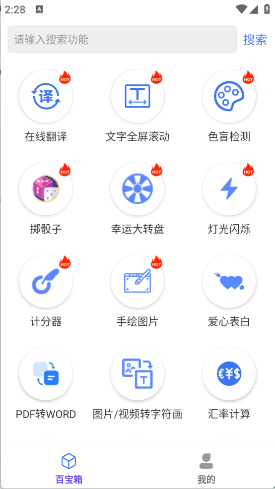 进入首页后,可使用的工具种类繁多,包括在线翻译、计算器和手持弹幕等,也能借助上方的关键词进行查找。