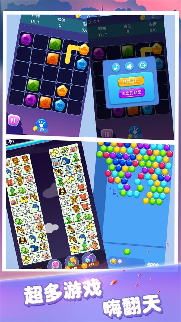 3、包含多种经典小游戏,如连连看、泡泡龙、宝石连线、数字消除等,一应俱全!