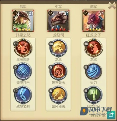 2、当势力值达到600时,你会获得新手期神将——龙祭祀。他的光环技能在准备阶段就能生效,锁定我军的两名英雄先手加成,并削弱敌军的两名英雄的伤害。