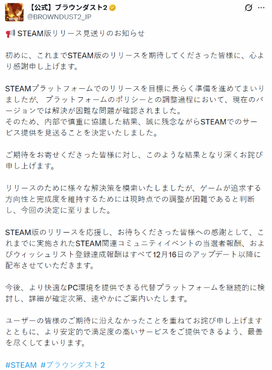 虽然为发布尝试了多种解决方案,但为保持游戏所追求的方向性与完成度,我们认为现阶段难以进行调整,故而作出此项决定。