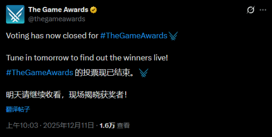 就在刚刚,TGA官方宣布本届TGA投票已正式结束。同时官方也提醒大家,明早的颁奖典礼千万不要错过,各大奖项的获奖者将在那时揭晓。