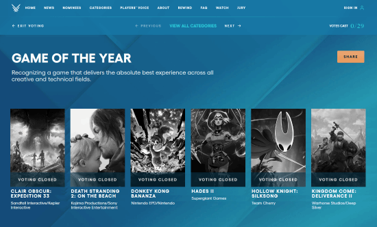目前TGA官网的投票页面依旧存在,只是既不能进行选择操作,也无法完成投票,并且游戏封面都已呈现为黑白样式,不过各个奖项的提名信息仍然可以浏览查看。