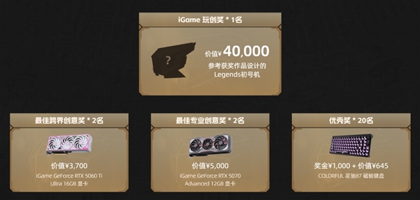 此外还设有“最佳概念设计奖”、“最佳专业设计奖”等多个奖项,奖品包括最新的iGame RTX 5060 Ti/5070显卡,以及奖金周边外设等。
