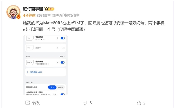 博主旺仔百事通发文表示,他给华为Mate 80 RS非凡大师办理了eSIM,回归属地还可以安装一号双终端(仅限中国联通)。